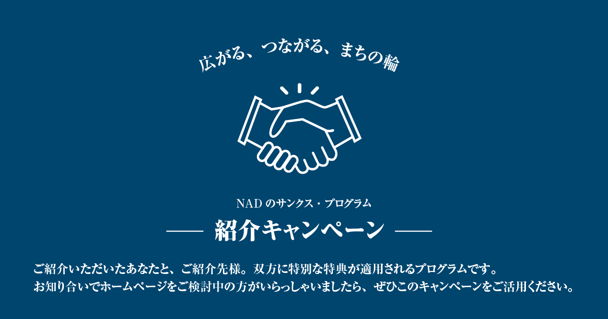 ご紹介いただいたあなたと、ご紹介先様。双方に嬉しい特典をご用意!お知り合いにホームページ制作を検討中の方がいらっしゃいましたら、ぜひこのキャンペーンをご利用ください。